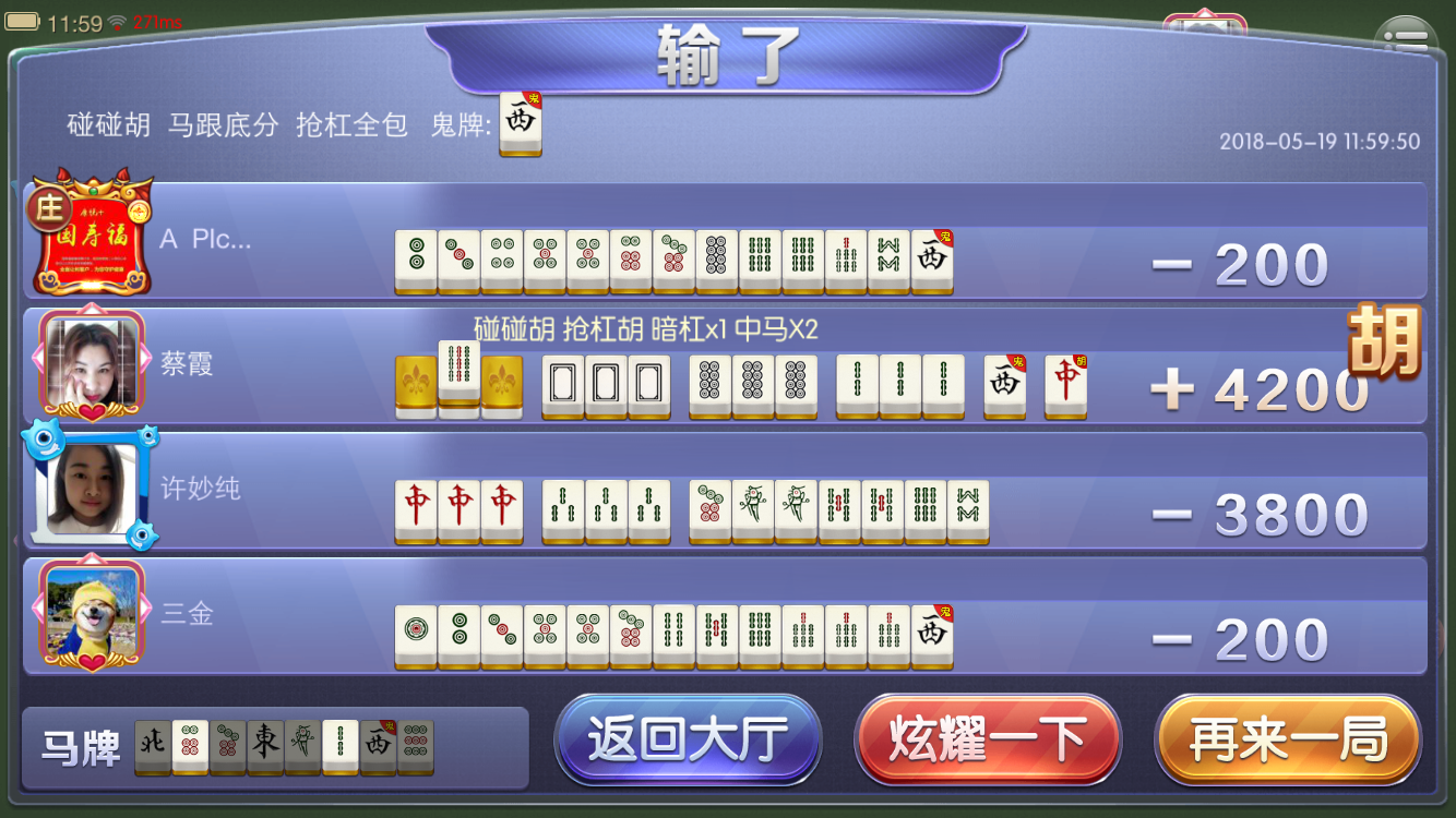 战绩: 查询战绩,观看之前的战绩,观看每一局每个玩家的牌型,出牌方式,可以查看是否有作弊嫌疑。 查询其他玩家的回放,通过别人分享的回放码可以观看他人回放
